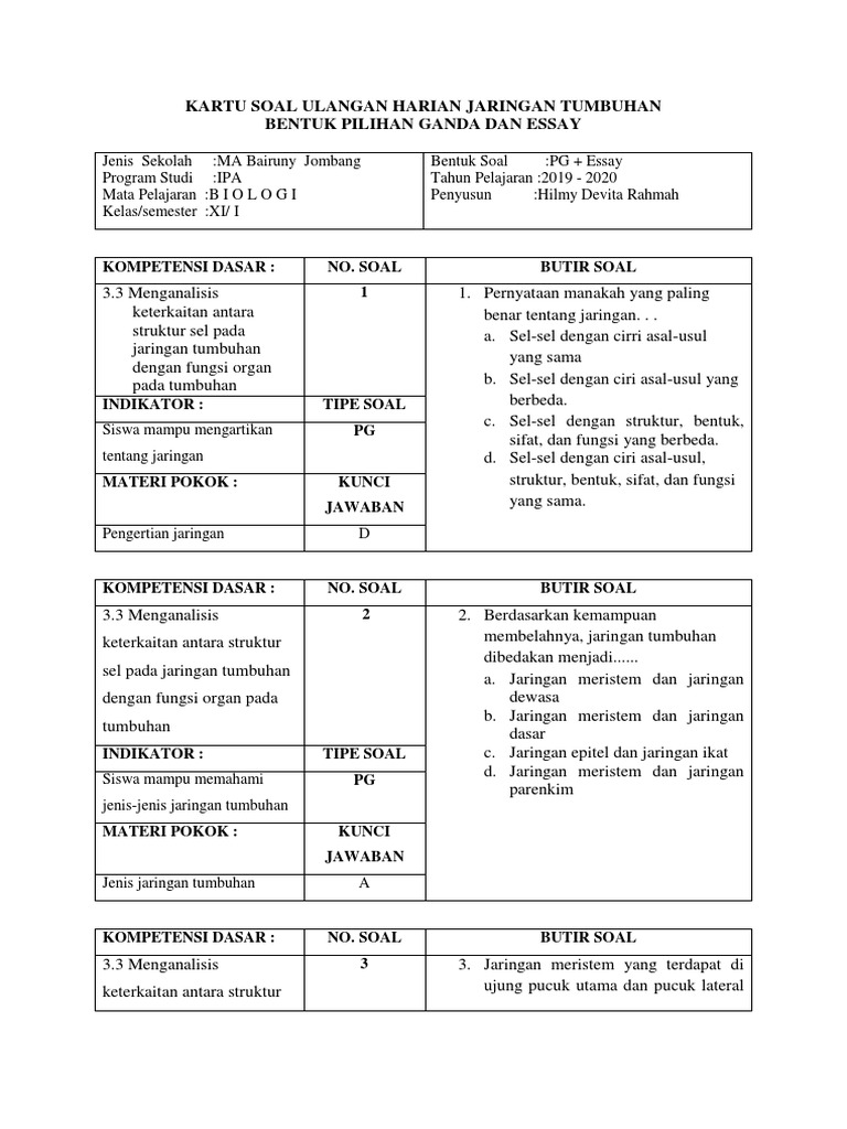 Kartu Soal Ulangan Harian Jaringan Tumbuhn