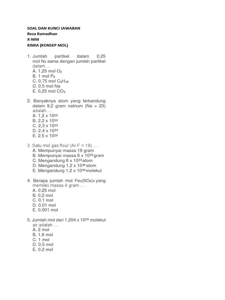 Soal konsep mol doc. Download Full PDF Package. Satuan mol sekarang dinyatakan sebagai jumlah par-tikel atom molekul atau ion dalam suatu zat. Partikel-partikel materi dapat berupa atom molekul dan ion.